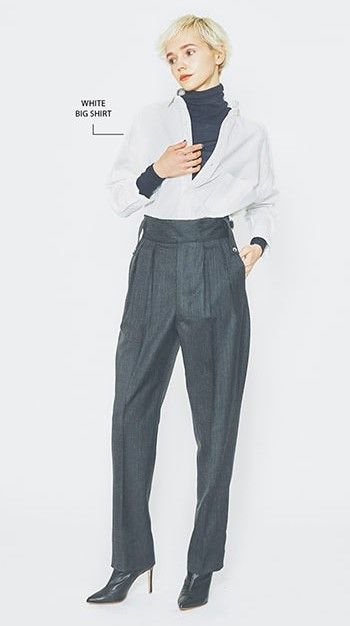 冬は眠りがちなシャツ。ニットの中に着るのが常套手段だけど「外で羽織り的に」活用。白シャツ+タートルの正統派なレイヤードは、シャツの胸元をざっくりと開けてかたさをほぐして。顔まわりにシャープなラインをつくると、暗色のボトムを合わせても重厚感が出ない。