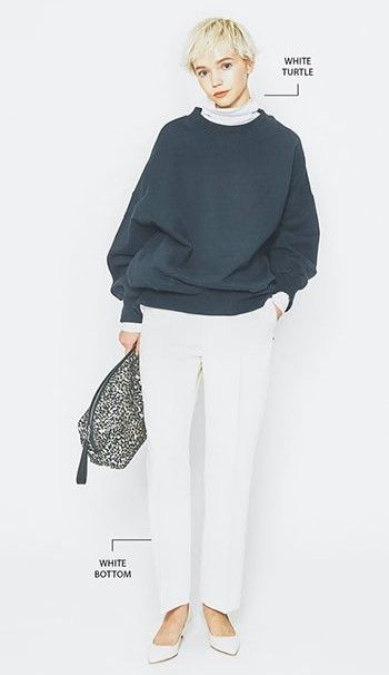 Iラインをつくるように、中に着たタートルと細身パンツを白で統一。そして上からスウェットやニットをかぶせるだけ。白によって全体のトーンが上がることで、ビッグスエットのボリューム感を軽減しつつ、重ね着の鮮度も上がる。上下のシルエットの差や配色にコントラストをつければ、白も膨張して見えない。