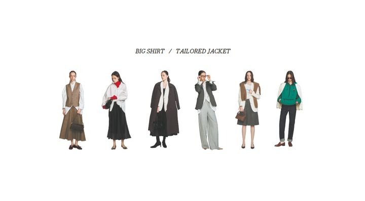 ①暗色を「見慣れた白で軽くする」 ②「主役で使わない」で冬の白はうまくいく。縦につないだり、間からのぞかせたり、上にかぶせたり。定番の白トップスでできる、重たい服に抜けを出すテクニック。軽さをつくると同時に、単純なスタイリングにひねりを加えたいときにも効果的。