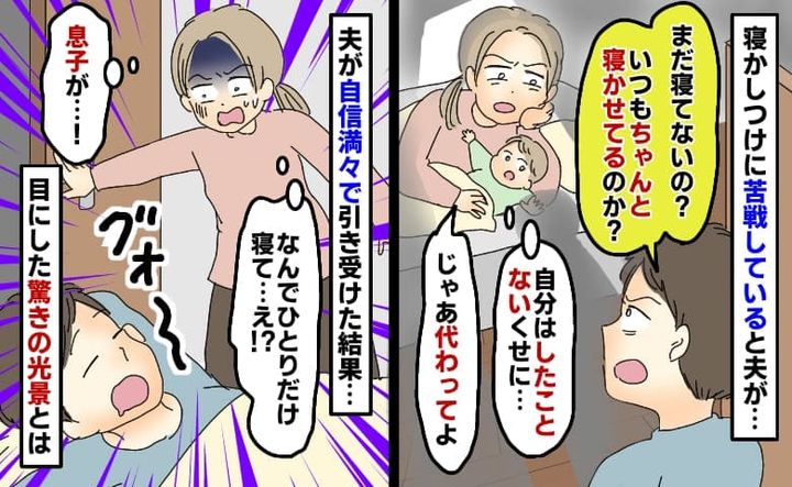 3年前のある日の夜、私はなかなか寝ない2歳の息子の寝かしつけに奮闘していました。焦る気持ちを抑えながら頑張っていると、「毎日のルーティーンが確立できていない!」と責める夫。怒った私が、「じゃあ、あなたが代わりに寝かしつけして!」と返すと、夫は「ああ、俺がする。俺なら息子は秒で眠る!」と、寝かしつけを始めましたが……?