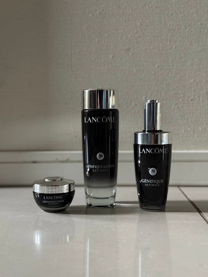 右から:ジェ二フィック アルティメ セラム 50mL ¥18,700、同 エッセンス ローション 150mL ¥9,900、同 アイクリーム 20mL ¥11,000(全てランコム)