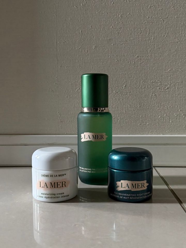右から:ザ・モイスチャライジング ナイト クリーム 60mL ¥73,700、ザ・バランシング トリートメント ローション 150mL ¥22,000、クレーム ドゥ・ラ・メール 60mL ¥59,400(全てラ・メール)