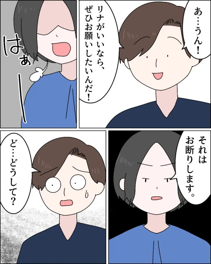 同意を求められたケイさんも「あ・・うん!リナがいいなら、ぜひお願いしたいんだ!」とにっこり。二人の身勝手な発言にリナさんは「はぁー」と大きなため息をつくと、「それはお断りします」ときっぱり。断られると思っていなかったのか、ケイさんは「ど・・どうして?」と驚きます。