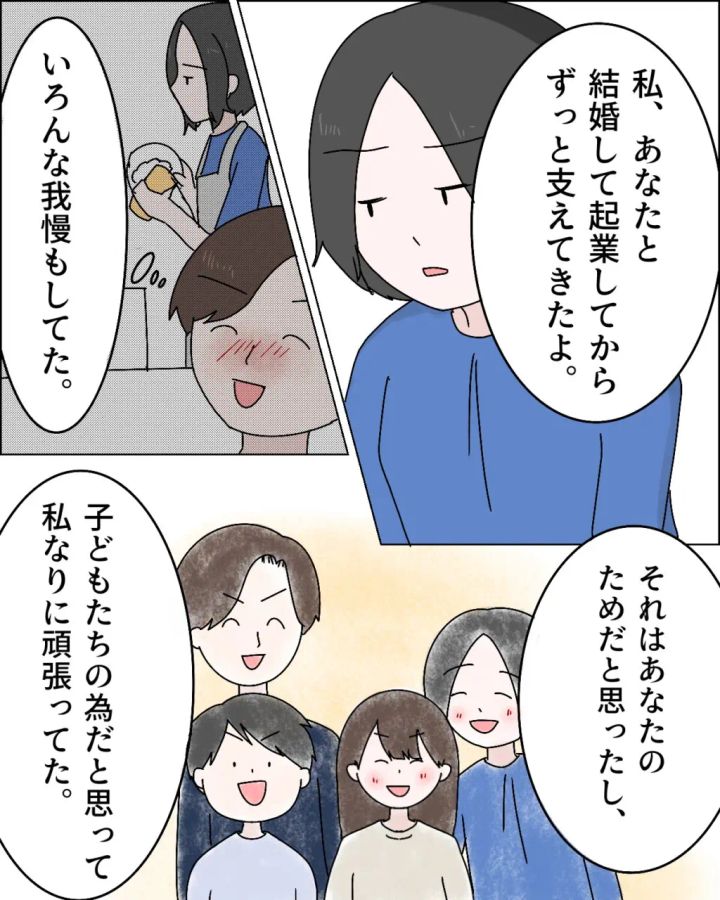 リナさんはこれまでのことを思い返しながら話し始めました。「私、結婚してあなたが起業してからずっと支えてきたよ。いろんな我慢もしてた。それはあなたのためだと思ったし、子ども達の為だと思って私なりに頑張ってた」