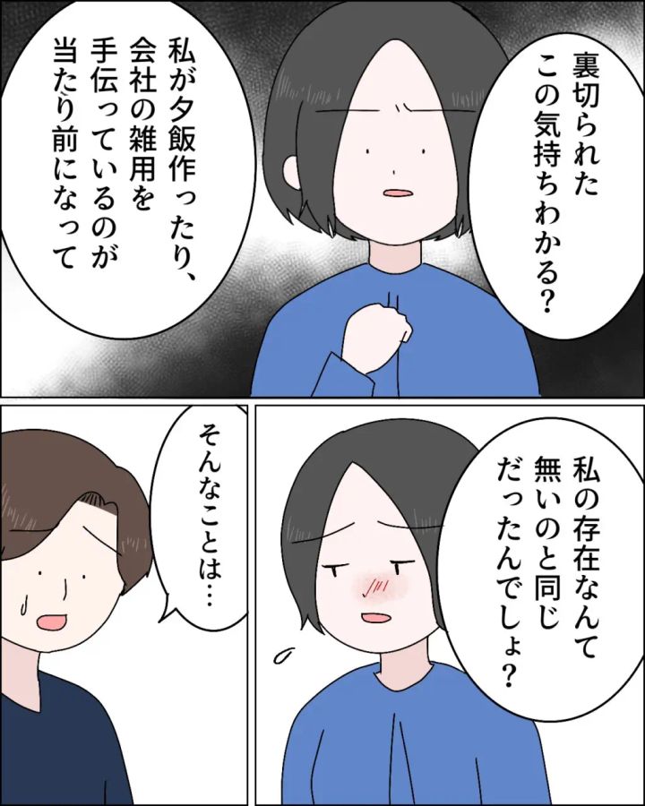 「裏切られたこの気持ちわかる?私が夕飯作ったり、会社の雑用を手伝っているのが当たり前になって私の存在なんて無いのと同じだったんでしょ?」リナさんにそう言われて、ケイさんは「そんなことは・・」と口ごもります。