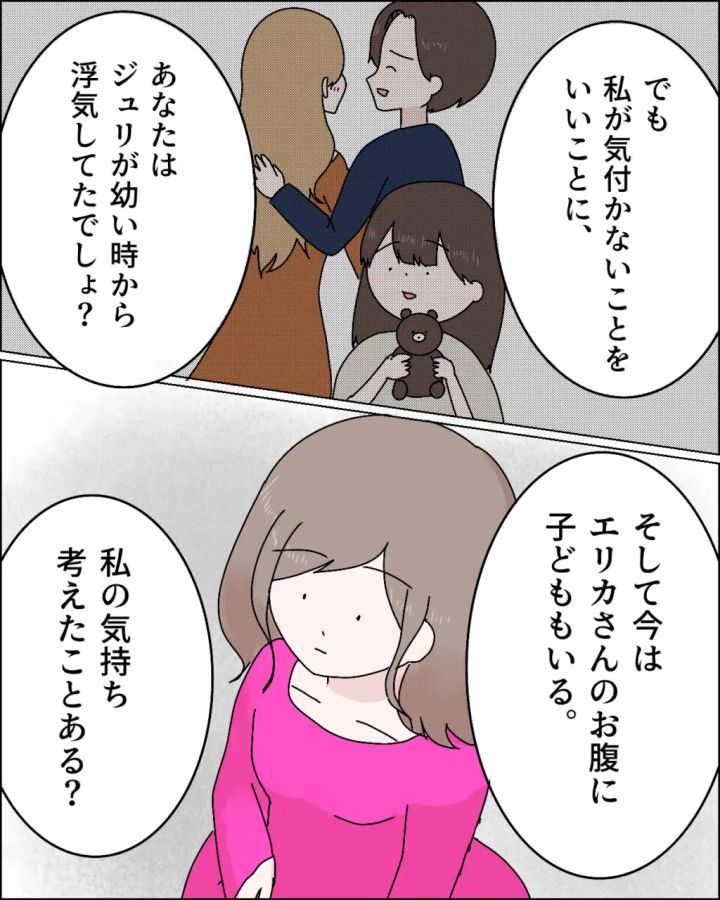 「でも、私が気付かないことをいいことに、あなたはジュリが幼い時から浮気してたでしょ?そして今はエリカさんのお腹に子どももいる。私の気持ち考えたことある?」リナさんの話をエリカさんは黙って聞いていました。