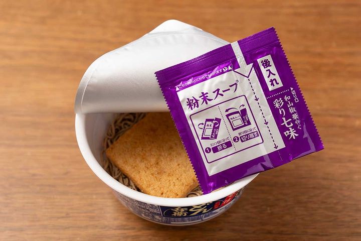 容器の中には、麺と具材のほかに「粉末スープ」「彩り七味」の袋が入っています。