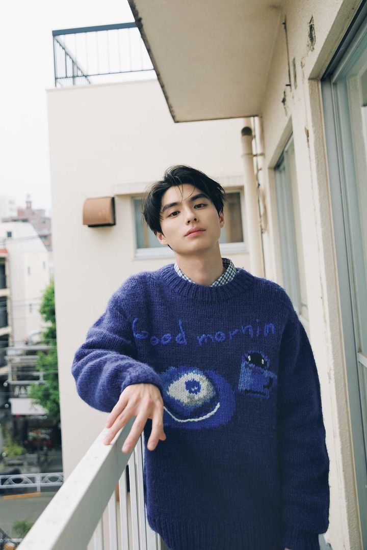 本田響矢。ar9月号より ニット¥59,400/シン ヤコヅカ(ザ・ウォールショールーム) 中に着 たシャツ¥51,480/マナベ(ヘムト PR) パン ツ¥6,600/キャスパージョン(シアン PR) ロ ーファー¥25,300/ティンバーランド(VFジャ パン)
