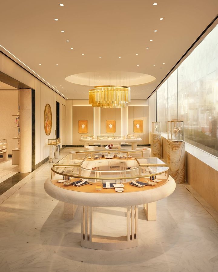 エントランスには、ローマ・コンドッティ通りの本店と同様に、古代ローマ建築を象徴する石材“トラバーチーノ・ナヴォーナ”を採用。店内へ足を踏み入れると、彫刻的なトラバーチンの円形カウンターと、ヴェニーニによるムラーノガラス製シャンデリアが迎えてくれる。シャンデリアはブルガリのアイコンのひとつ「セルペンティ」を讃えるデザインに仕上げられ、ブランドの歴史的コードが現代的に再解釈されている。
