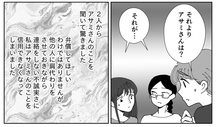 ルリコさんとサキさんから、アサミさんのことを聞いて驚きました。もちろんアサミさんに弁償しろと言うつもりはありません。しかし関係のないルリコさんとサキさんに弁償を肩代わりさせておきながら、自分は返事もロクにしないというのは人としていかがなものなのでしょう……。