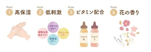 • 4つのフリー処方(アルコールフリー、パラベンフリー、動物由来成分フリー、鉱物油フリー)を実現