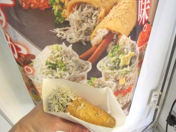 朝獲れのしらすのおいなりさん。ロールの可愛いお稲荷さんです。