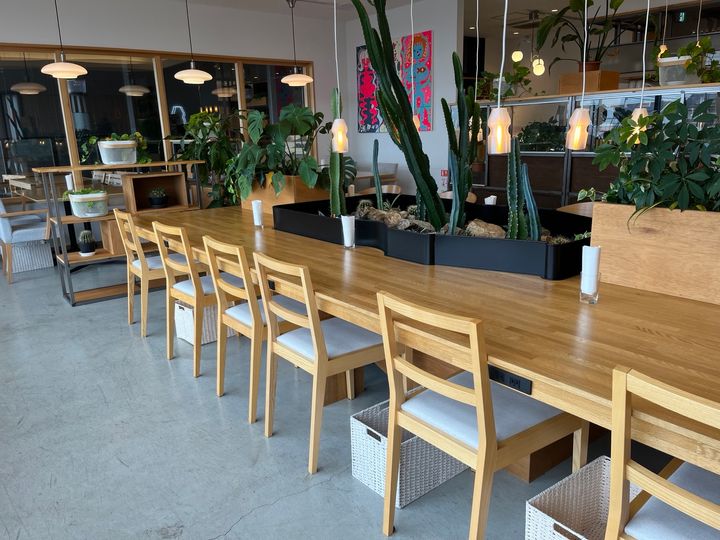 大きなガラス窓、開放的で素敵。また店内には沢山グリーンがあって、なんとも健康的な空間ですね。