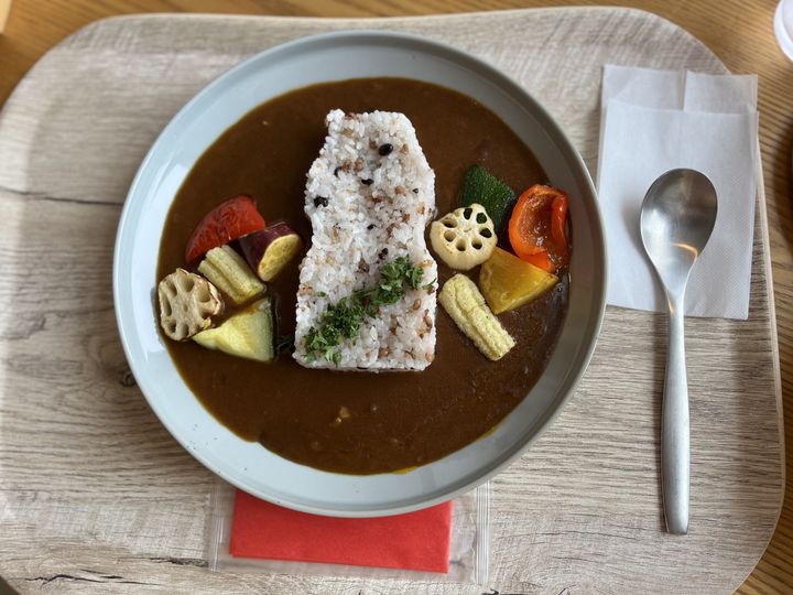 大きくカットされたお野菜は、それぞれの素材の味が感じられてとても美味しい。スパイスもしっかり効いています。穀物ご飯の色もよく映えますね。味覚も視覚も楽しい。