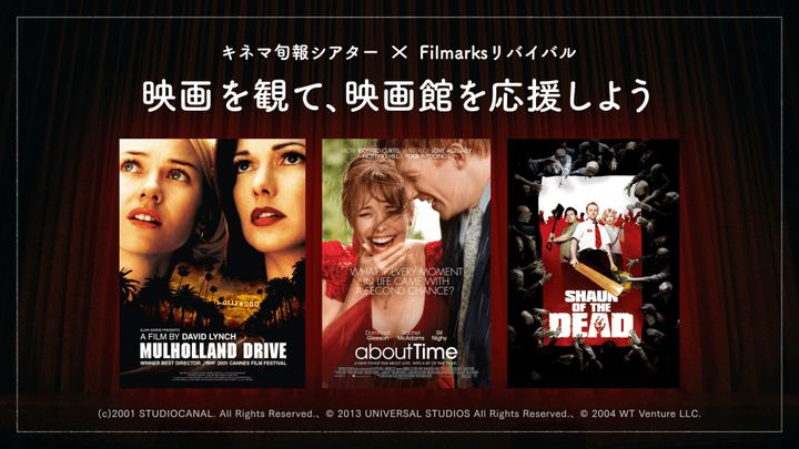 国内最大級の映画・ドラマ・アニメのレビューサービス Filmarks(フィルマークス)主催のリバイバル上映プロジェクトにて、「映画館応援上映企画」として、『マルホランド・ドライブ 4Kレストア版』『アバウト・タイム 愛おしい時間について』『ショーン・オブ・ザ・デッド 4K』の3作品を、施設老朽化により映画館存続のために支援を募っている、千葉県柏駅前のキネマ旬報シアターで、12月6日(土)より順次上映することが決定しました。