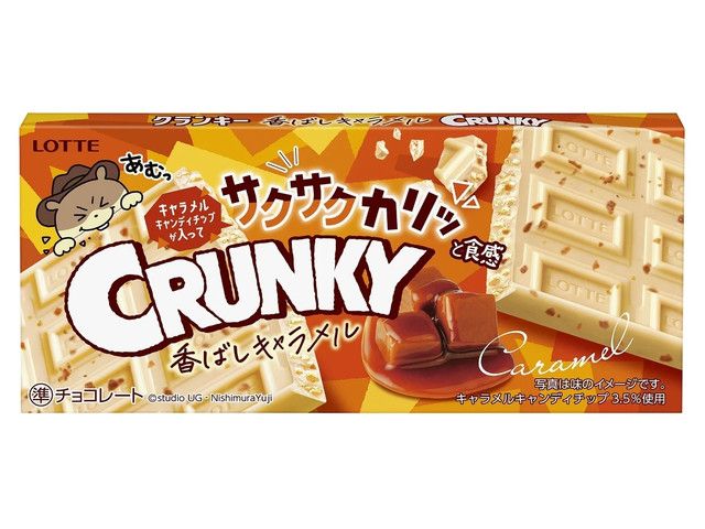 ホワイトチョコに、キャラメルキャンディチップを練りこみました。 クランキーのサクサク感と相まり、サクサクカリっとした食感をお楽しみいただけます。 クランキーぼうやを載せたポップなデザインにしています。