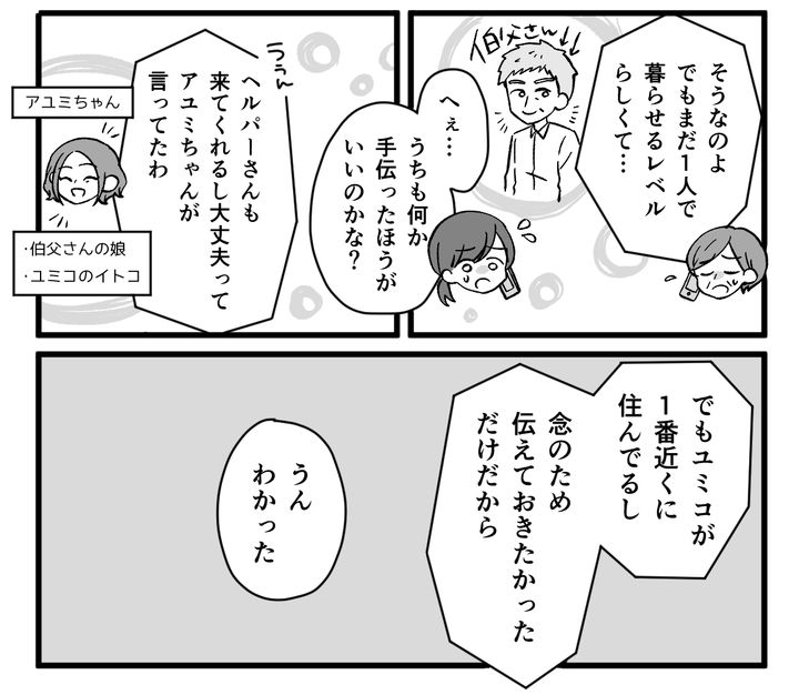 私(ナカノユミコ、40代)は夫(40代)と中学生、小学生の子どもたちと地元で暮らしています。父は亡くなっており、近所の実家では母(マチ、70代)と兄家族が同居中です。伯父(ノブオ、70代、父の兄)も近くで1人暮らしをしているため、遠方に住む従姉妹(アユミ、40代、伯父の娘)に代わって、私やアユミちゃんの母方の親戚が時々伯父の様子を見に行っています。親戚同士の仲がいいため、高齢になった親のサポートをみんなでしているような状況です。