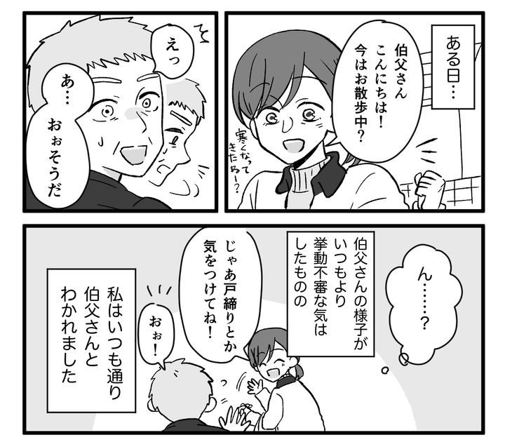 その後、私はたまに伯父を見かけると、いつもより積極的に声をかけるようにしました。伯父は一見、認知症には見えず、受け答えもしっかりしています。ただこの日は、普段よりどこか様子が落ち着かない伯父に、少し違和感を覚えました。