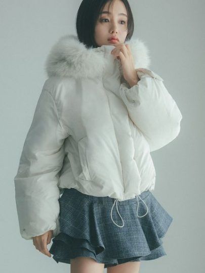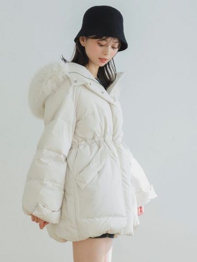 寝具メーカー”西川”ダウンを使用した、フードファーショートダウン。タイトなワンピースやミニボトムなど、トレンドアイテムとバランスが取りやすく、ボリュームを感じさせずスッキリと着られるのが魅力。裾のゴムドロストでシルエットに女性らしい丸みを出したり、気温や気分に合わせてシルエットチェンジが可能。