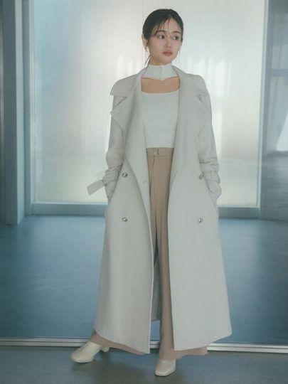 ウールとカシミヤ混の上質な生地を、柔らかい手触りが特徴のビーバー加工でエレガントに仕上げたロングコート。スタンドカラー、ステンカラー、テーラードカラーにアレンジができる3WAY。艶感の美しいメタルボタンを使用して上品に。共布のベルトでシルエットにメリハリをつけて女性らしくご着用いただけます。