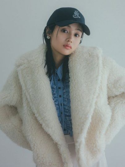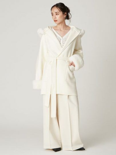 衿と袖にエコファーを贅沢にあしらったリバーコート。上品だけどコンサバになりすぎない秘訣は、リラクシーなフードデザインや抜け感のある大きめのポケットのおかげ。ボタンレスのフロントデザインを活かしてサラッと着流すように羽織ると、自然と余裕が漂います。オール白コーデも素敵!