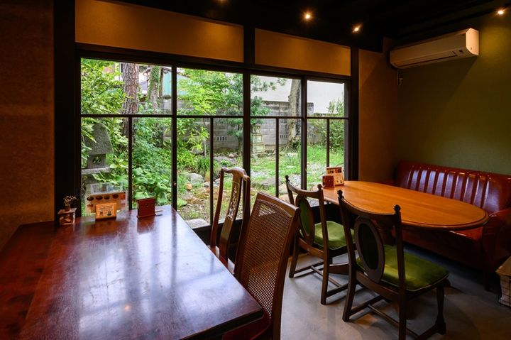 店内のインテリアはアンティーク調のテーブルや椅子などで揃えられています。一方、土壁や建物の柱、梁は町家の建物をそのまま生かし、150年以上前の趣も留めています。新旧の要素が入り混じるしつらえがとても印象的。おススメは庭を眺めることができるテーブル席で、青々と茂る木々や草花に癒やされます。