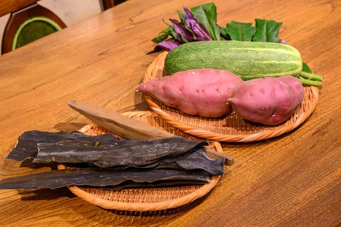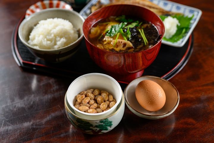 今回はこれに栄養豊富な平飼いの生卵と石川県産ダイズの大粒納豆を追加しました。味噌汁の具材だけでなく、料理に使用する食材、器や皿のほぼすべてをオーナーが石川県や北陸産にこだわって厳選し取り入れています。