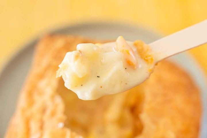 そのあとにシチューをつけて食べると……やっぱり最高! チキンと北海道産じゃがいも、にんじん、コーン、たまねぎをたっぷりと使用したシチューは、野菜の甘みやチキンのうまみが溶け出し、コク深くてクリーミーな味わいです。パイ生地との相性が抜群にいいですね。