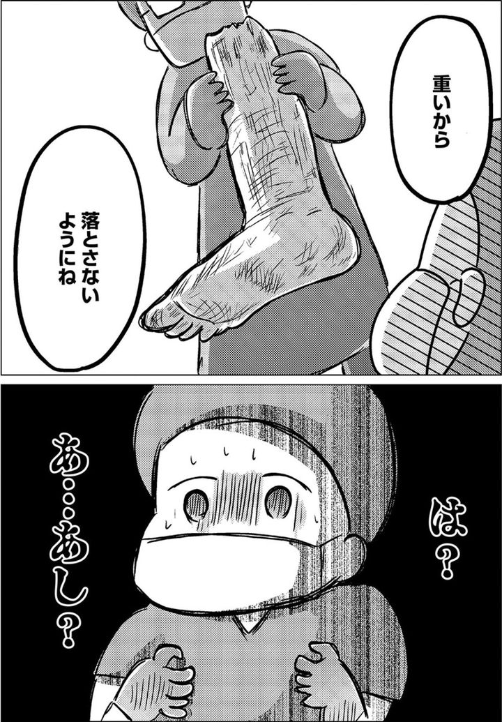 「重いから落とさないようにね」手渡されたのは、切断された足だった