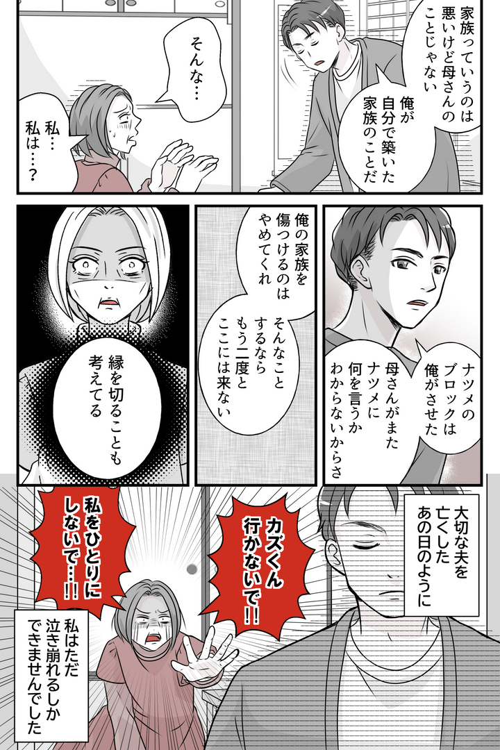 大好きなカズキが近くに引っ越してきてから、私は何かと理由をつけてカズキを呼び出していました。しかしいつも嫁と孫たちまで付いてくるので内心イライラ。私はカズキに、「次からはひとりで来て」と伝えました。ある日、ひとりで来てくれたカズキの手にそっと触れようとしましたが、冷たく拒否され、抱きしめようとしたところ振り払われてしまいました。カズキは「家族が待っているから」とすぐに帰ってしまい、私は「あの嫁が早く帰るよう仕向けている!」と怒りの電話をかけました。これで思い知っただろうと思ったのに、カズキは以前より来なくなってしまったのです。