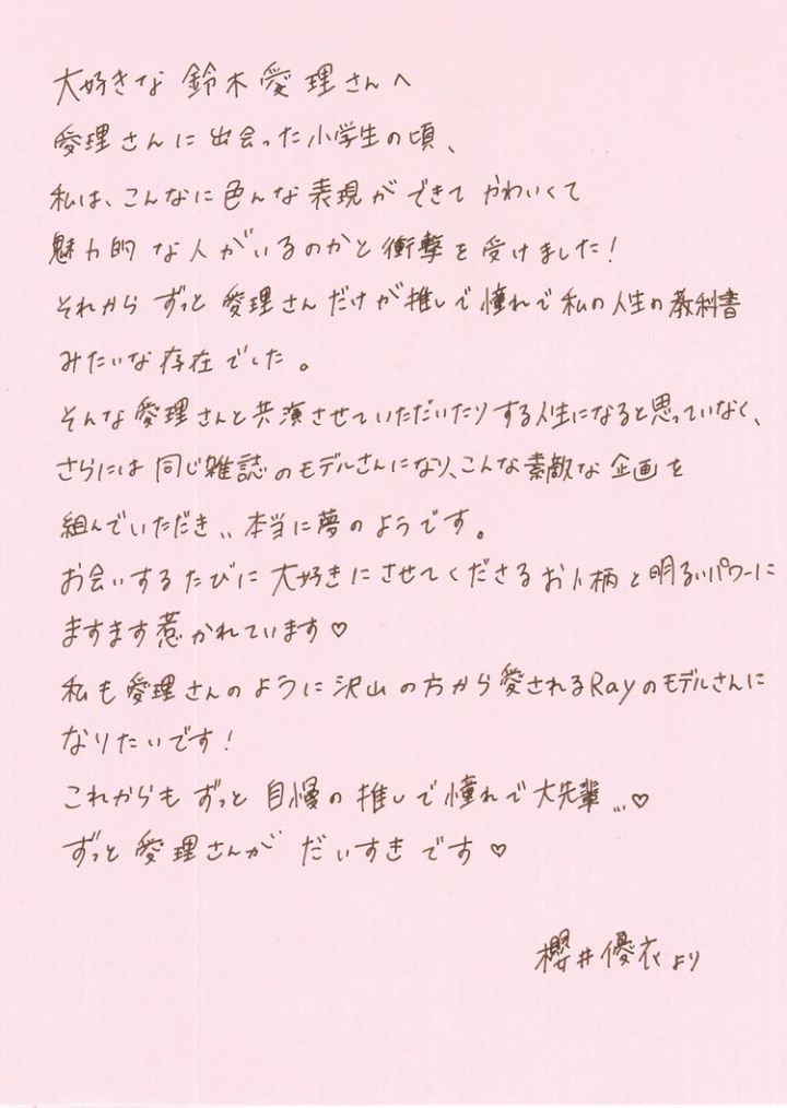 小学生の頃から“唯一の推し”として鈴木愛理さんを愛し続けてきた櫻井優衣。そこで今回は、Rayモデルとして活躍する彼女が、鈴木愛理さんとの出会いから現在までの深すぎる愛を語ります。推しがくれたエネルギーや心の支え、その尊さをたっぷりお届け♡