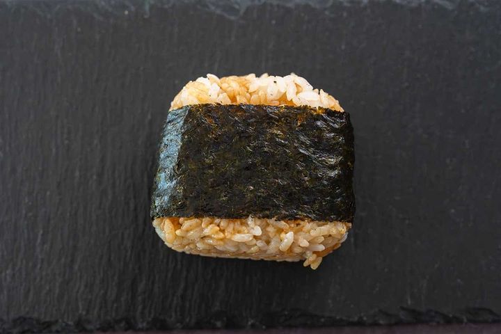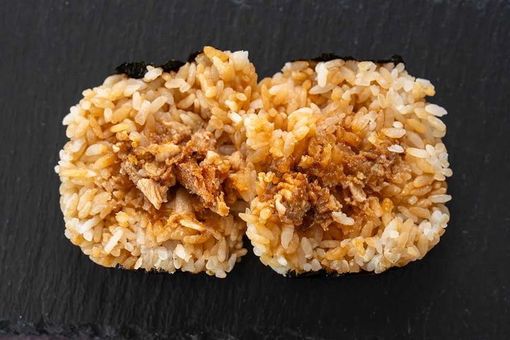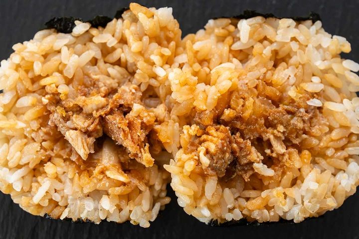 ふっくらと炊き上げられたご飯と、豚肉炒めの相性はばっちり! 甘辛い味付けの中具は、豚とにんにくの旨みがあり、ご飯が進む味わいです。海苔の風味もよいアクセントになっていますが、ほのかに感じるごま油もおいしさのポイントだと思います。