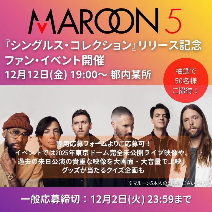 応募は本日から受け付け開始。特典グッズも用意され、まさに“当たれば人生がひとつ得する”レベルのイベントとなっている。マルーン5の歴史を、選ばれし50人の一員として体感したいなら、迷う理由はどこにもない。