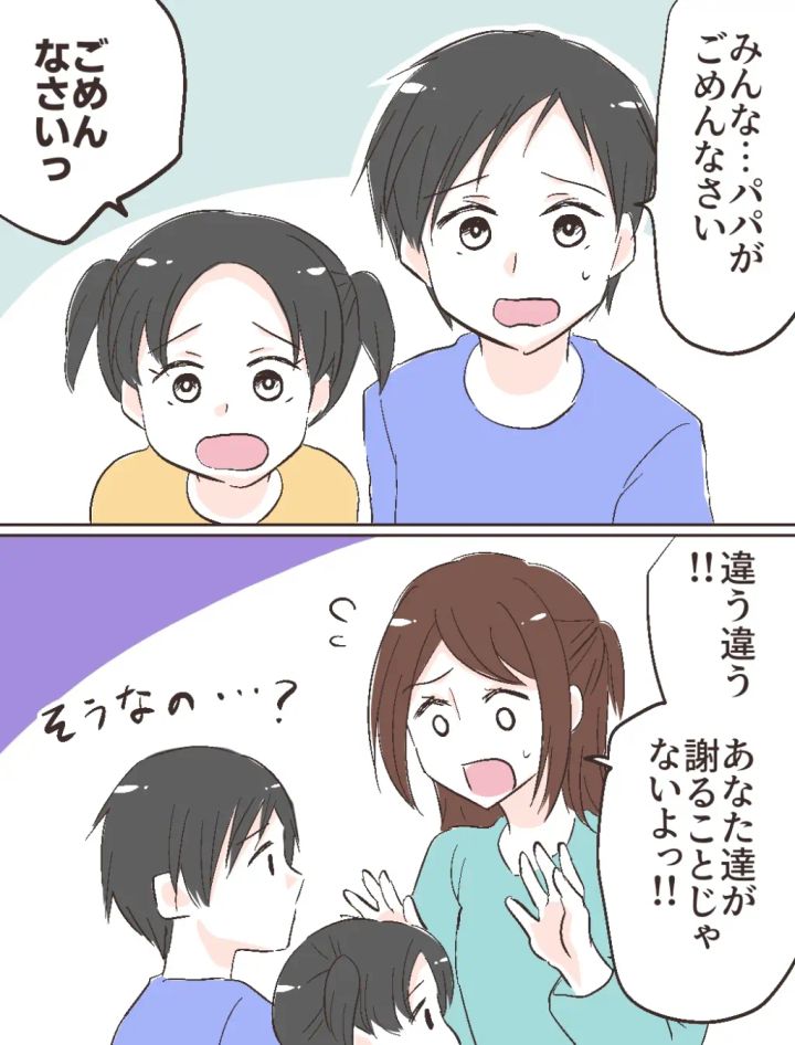 すると、みんなのやり取りを聞いていたユウヤとサラが「みんな・・パパがこめんなさい」「ごめんなさいっ」と今にも泣きそうな顔で謝りました。慌ててマミちゃんが「違う違う!!あなた達が謝ることじゃないよっ!!」と言いましたが、二人は申し訳なさそうにしたまま。