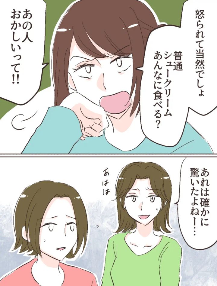すると、姪のマミちゃんが「怒られて当然でしょ。普通シュークリームあんなに食べる?あの人おかしいって!!」と腹立たしそうに言い、姉のサオリさんも「あれは確かに驚いたよねー・・」と苦笑い。