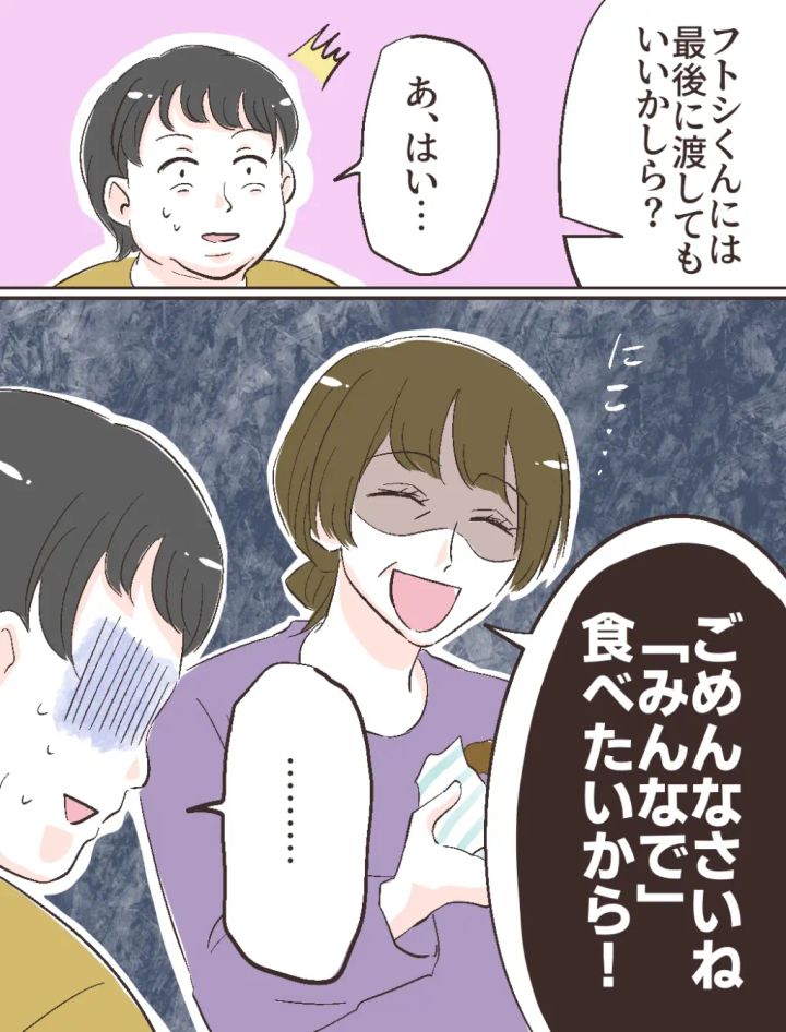 「フトシくんには最後に渡してもいいかしら?」と聞いた母は、「あ、はい・・」と元気なく答えたフトシに「ごめんなさいね。『みんなで』食べたいから!」とにっこり。母の笑顔から無言の怒りを感じたフトシは怖くて目が合わせられませんでした。