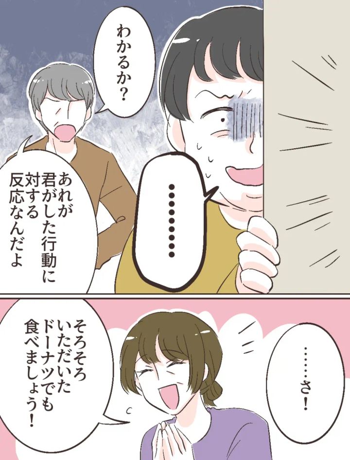 周りのことを考えず自分が食べたいだけ食べてしまうフトシさんがヒカリさんのお父さんから叱られたと聞いたみんなは、「怒られて当然」「あれは驚いた」「あれはない」とフトシさんを庇う人は誰もいませんでした。すると、それを聞いていたユウヤくんとサラちゃんが「みんな・・パパがごめんなさい」「ごめんなさいっ」と今にも泣きだしそうな顔でみんなに謝罪。その様子を目の当たりにし、お父さんからも「あれが君がした行動に対する反応なんだよ」と言われたフトシさんは絶句し、ようやく自分の行動がおかしいことに気づきます。微妙な空気を変えようと「ドーナツでも食べましょう!」と提案したお母さんは、「フトシくんには最後に渡していいかしら?ごめんなさいね。みんなで食べたいから!」とにっこり笑顔でしっかり皮肉を言い、フトシさんは返す言葉もありません。