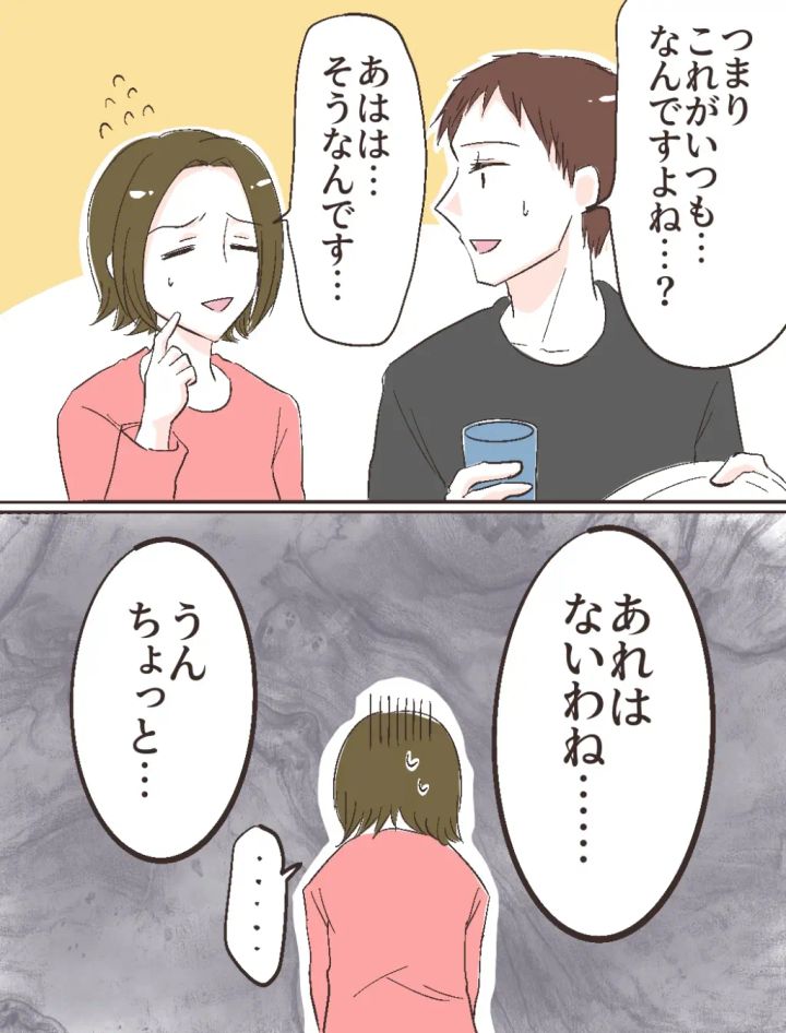 ユカリ姉の夫ヨシキさんが「つまり、これがいつも・・なんですよね・・?」と恐る恐る聞くと、「あはは・・そうなんです・・」と気まずそうに言うしかありませんでした。「あれはないわね・・」「うん、ちょっと・・」みんなから口々に言われ、いたたまれない気持ちに。