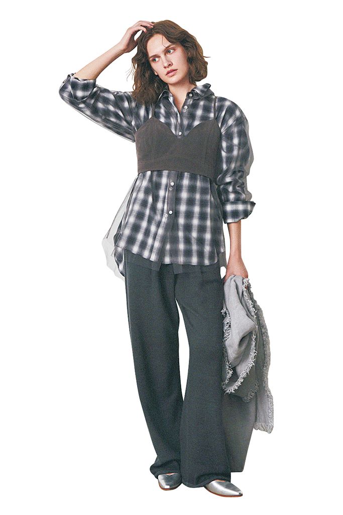 ニットパンツは着まわし。レイヤードシャツ、ビスチェ/ともにUngrid 手に持ったストール/アソース メレ(アイネックス) フラットシューズ/ダイアナ(ダイアナ 銀座本店)