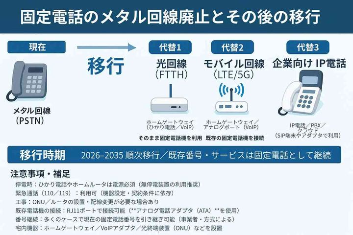 NTT東西は、メタル回線が老朽化しているため、2026年度から段階的に廃止し、2035年をめどに移行する方針を明らかにしています。これに伴い、固定電話料金は2026年4月より値上げされる見込みです。固定電話を使用しない家庭であれば、解約することで年間約2万円~3万円の固定費節約が可能であり、経済的なメリットは大きいと言えます。