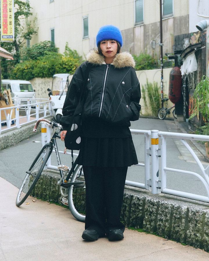 今日の着こなしポイント:オールブラックに挿し色でブルー、ハズしでドット柄バッグをアクセントとして加えたことです!
