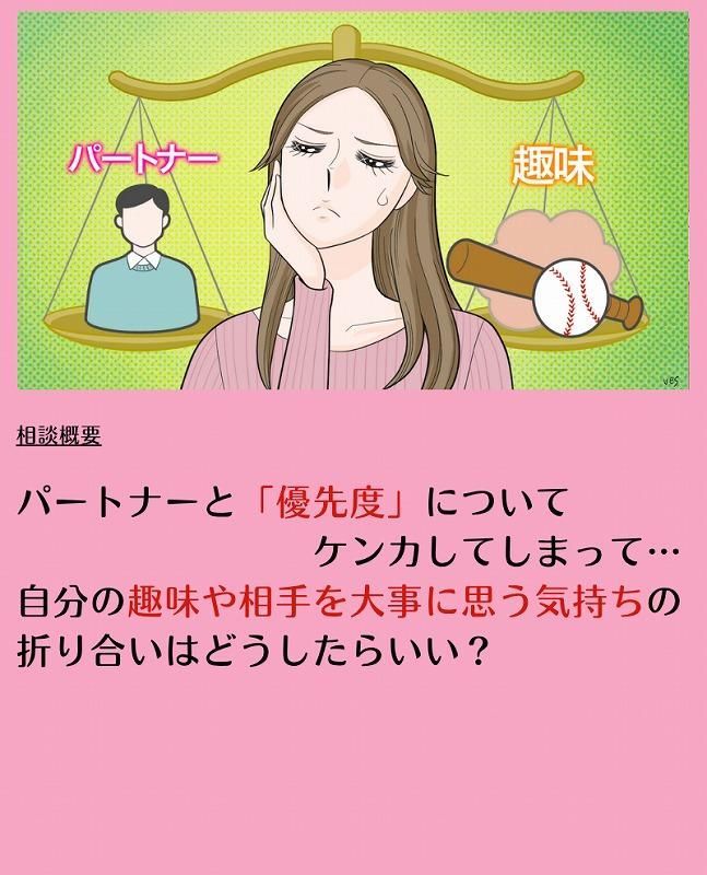読者からのお悩み「大切なパートナーと『優先度』に関してケンカ…趣味と相手、どちらも大切だけどどうしたら…」