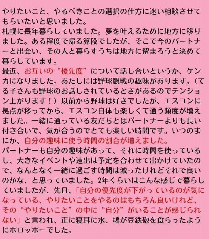 あなた、今自分の抱えている願いどうしの衝突、その苦しさを、パートナーさんに今一度「相談に乗ってほしいことがあるから、ちょっと聞いて」と伝えてみてはいかがだろうか。