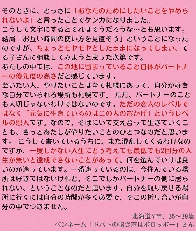 にしても「ドバトの鳴き声はポロッポー」さん。あなたのお悩み、深刻ね。## 大事な人と自分らしくいられる環境、そして暮らす場所まで…