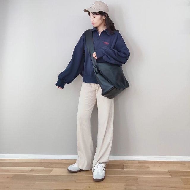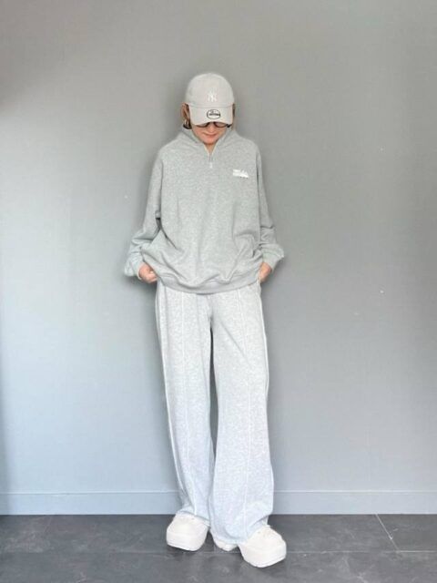 ハーフジップのスウェット×ゆったりめパンツのコーデ