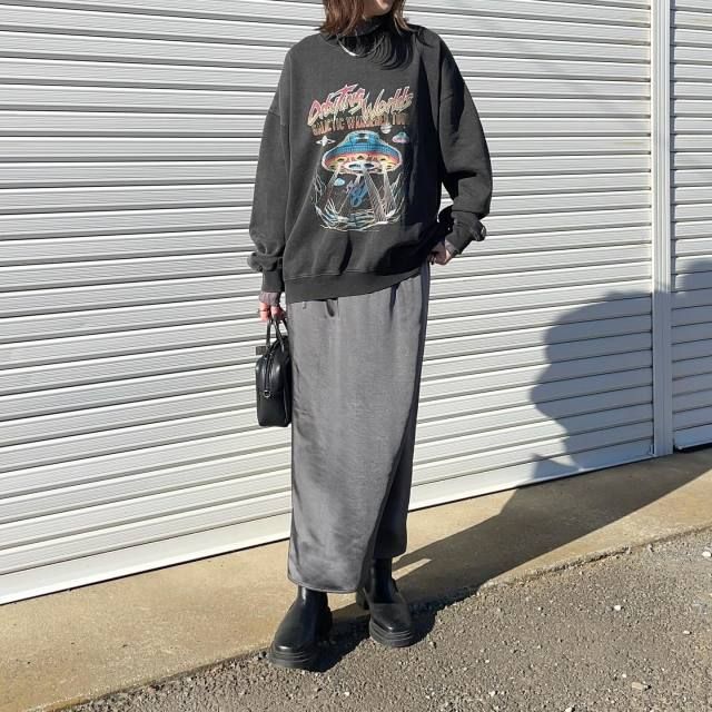 「スウェットのパジャマ見えが気になる」という場合は、プリント入りスウェットを選んでロングスカートを合わせてみて。インパクトのあるスウェットと大人っぽいスカートの組み合わせできれいめカジュアルなコーデが完成します。なお海外旅行時に文字プリントタイプのスウェットを着る場合は、文字の訳(意味)に気を付けて選ぶと◎です。