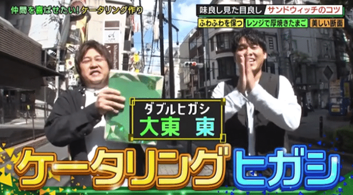 「ダブルヒガシ東のケータリングヒガシ」は、“料理好き芸人”のダブルヒガシ・東がプロに学んだ渾身の手料理を「よしもと漫才劇場」の楽屋にケータリングとして差し入れる企画の第2弾! 今回は、ケータリングメニューの王道「サンドウィッチ」を作る。