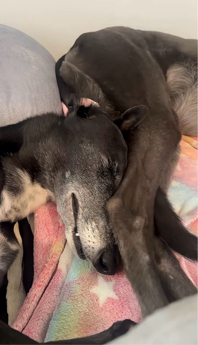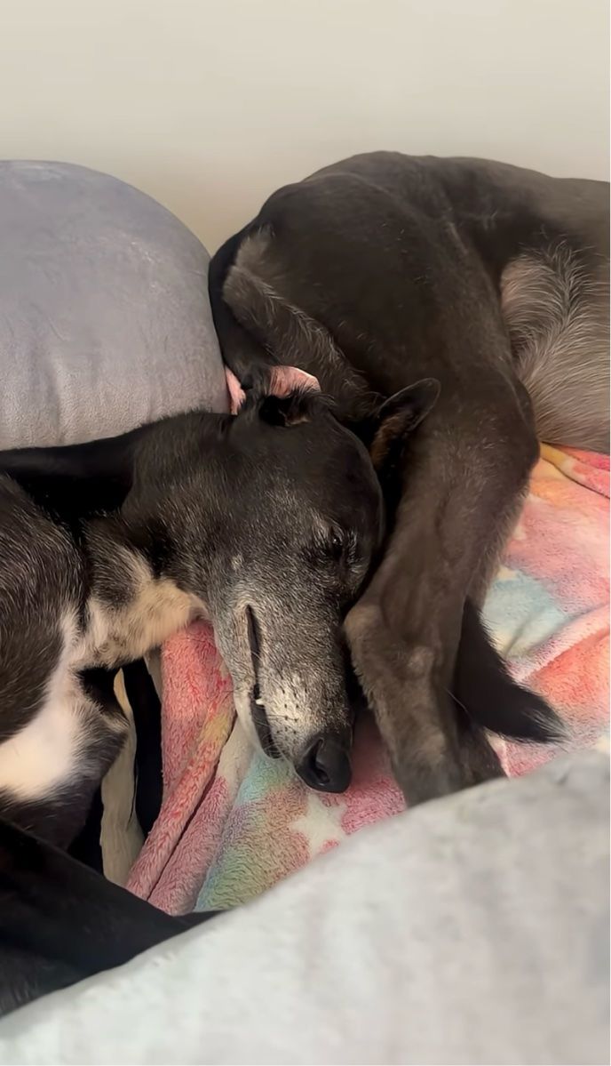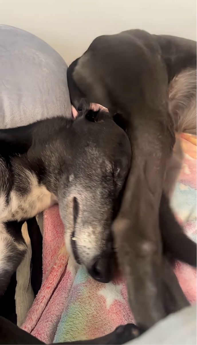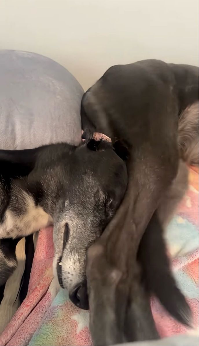 ポジション選びを間違えたグレイハウンド。寝たいのにお姉ちゃんの足が当たって全然寝られない!【海外・動画】