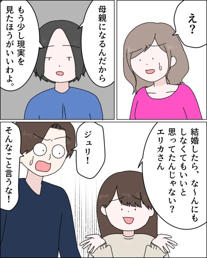 リナさんの言葉に「え?」と驚くエリカさん。「母親になるんだから、もう少し現実を見たほうがいいわよ」リナさんがそう言うと、「結婚したら、な~んにもしなくてもいいと思ってたんじゃない?エリカさん」とジュリちゃんが少しバカにしたような口ぶりで言うと、「ジュリ!そんなこと言うな!」とケイさんがジュリちゃんをたしなめました。