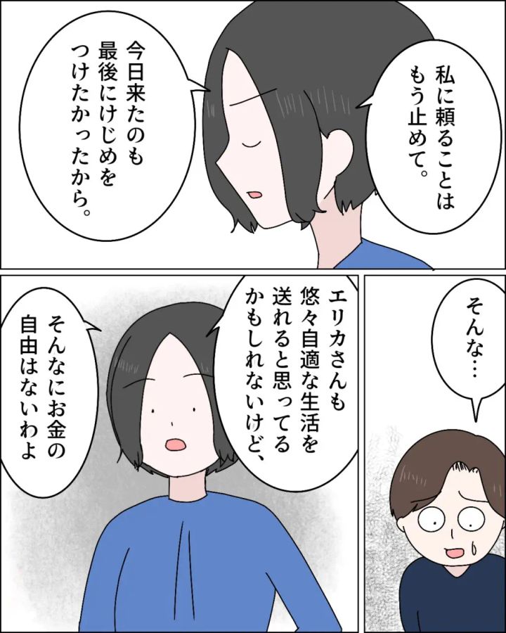 「私に頼ることはもうやめて。今日来たのも最後にけじめをつけたかったから」キッパリと言うリナさんに、「そんな・・」と困ったように言うケイさん。「エリカさんも悠々自適な生活を送れると思ってるかもしれないけど、そんなにお金の自由はないわよ」